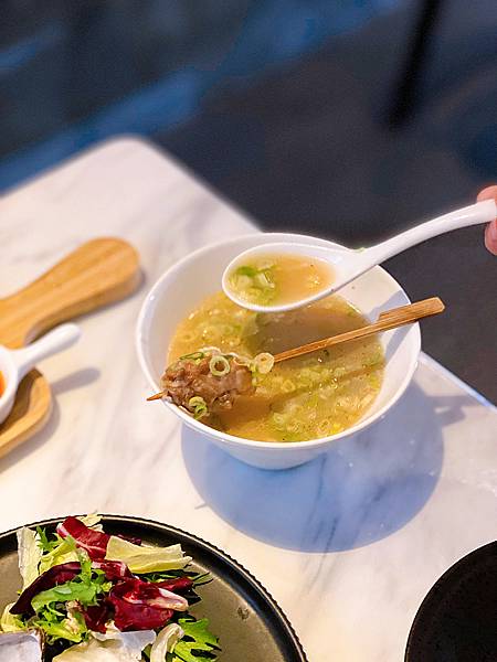 湯頭濃醇,上面還有一串雞肉捲呢~