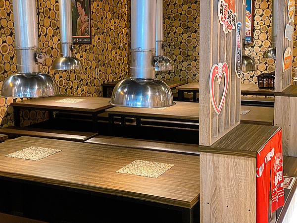 店裡的擺設以黃色木紋壁紙和桌椅為主,